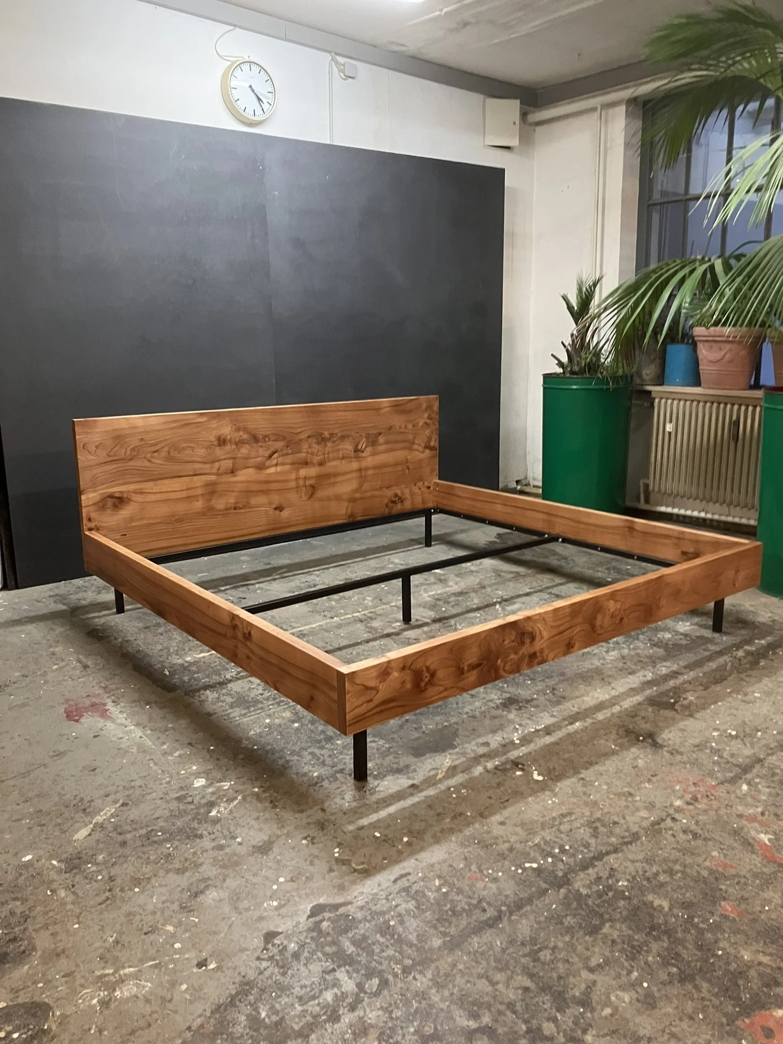 Bett aus Rüster oder Eiche geölt, Innenrahmen aus Stahl Vierkant, schwarz lackiert. Preis 2150 Euro