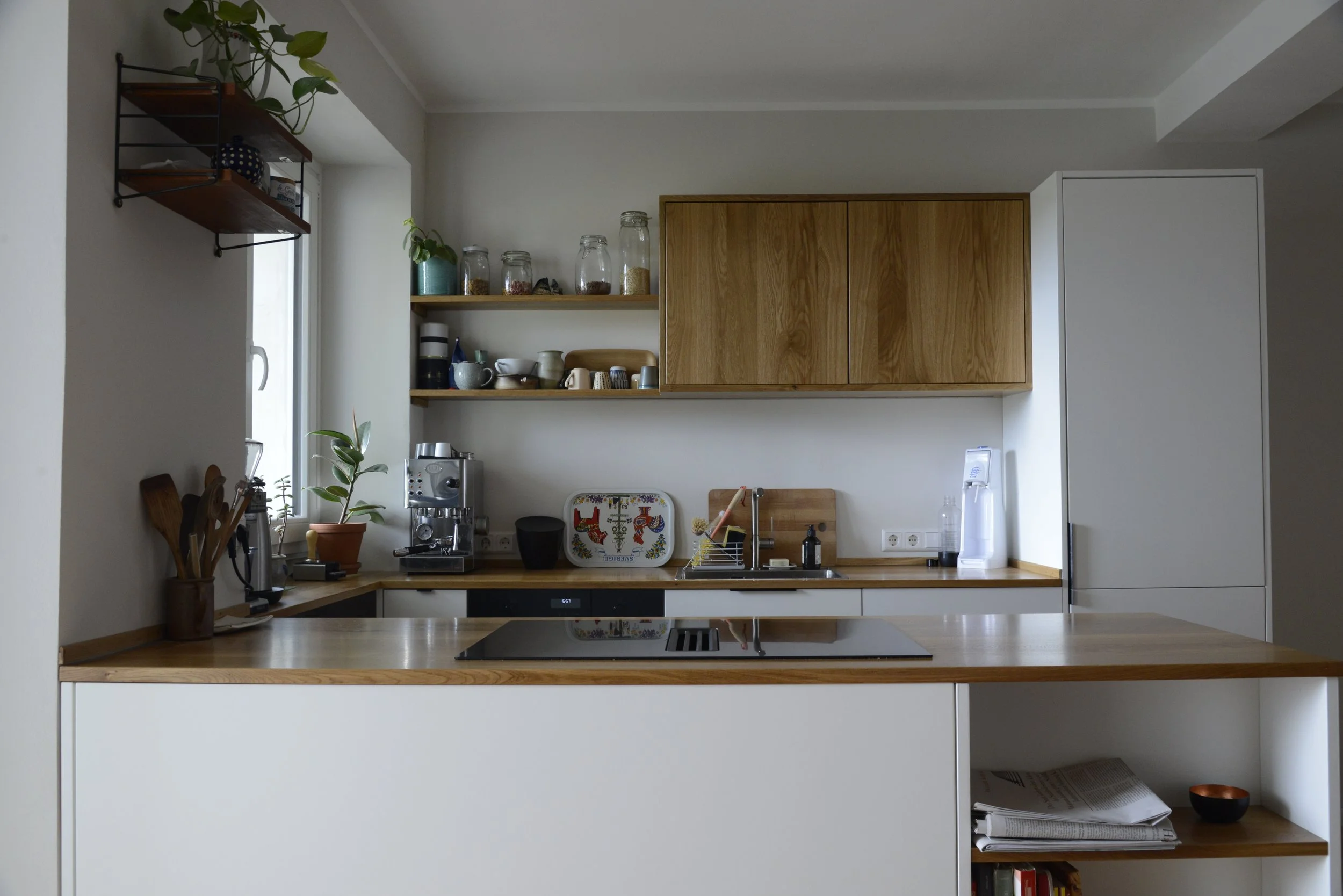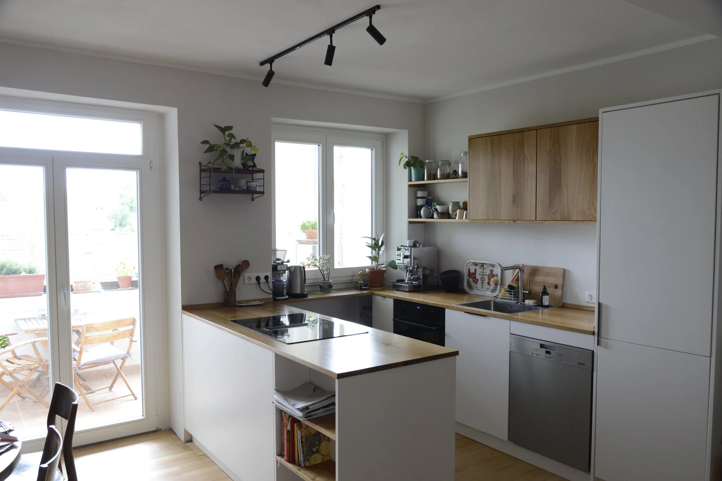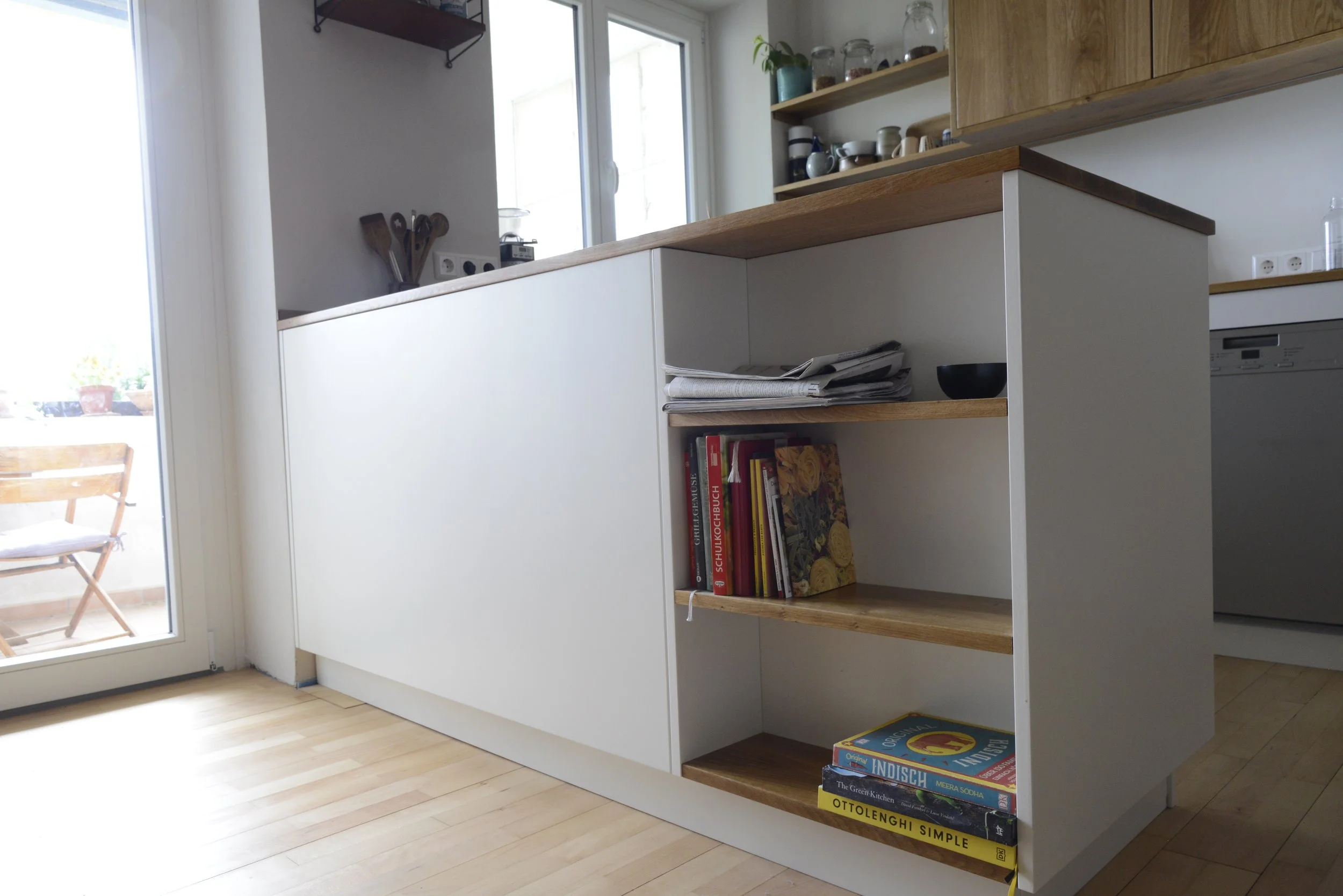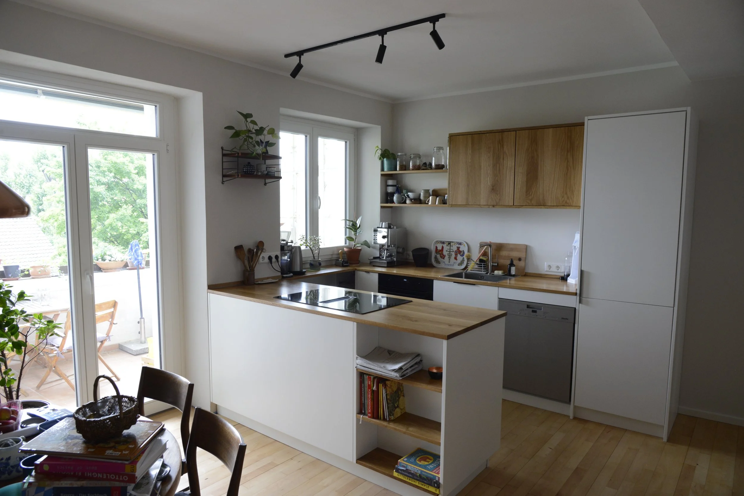 Küche aus MDF lackiert und Eiche. Vom Kunden abgeholt und in Heidelberg montiert.