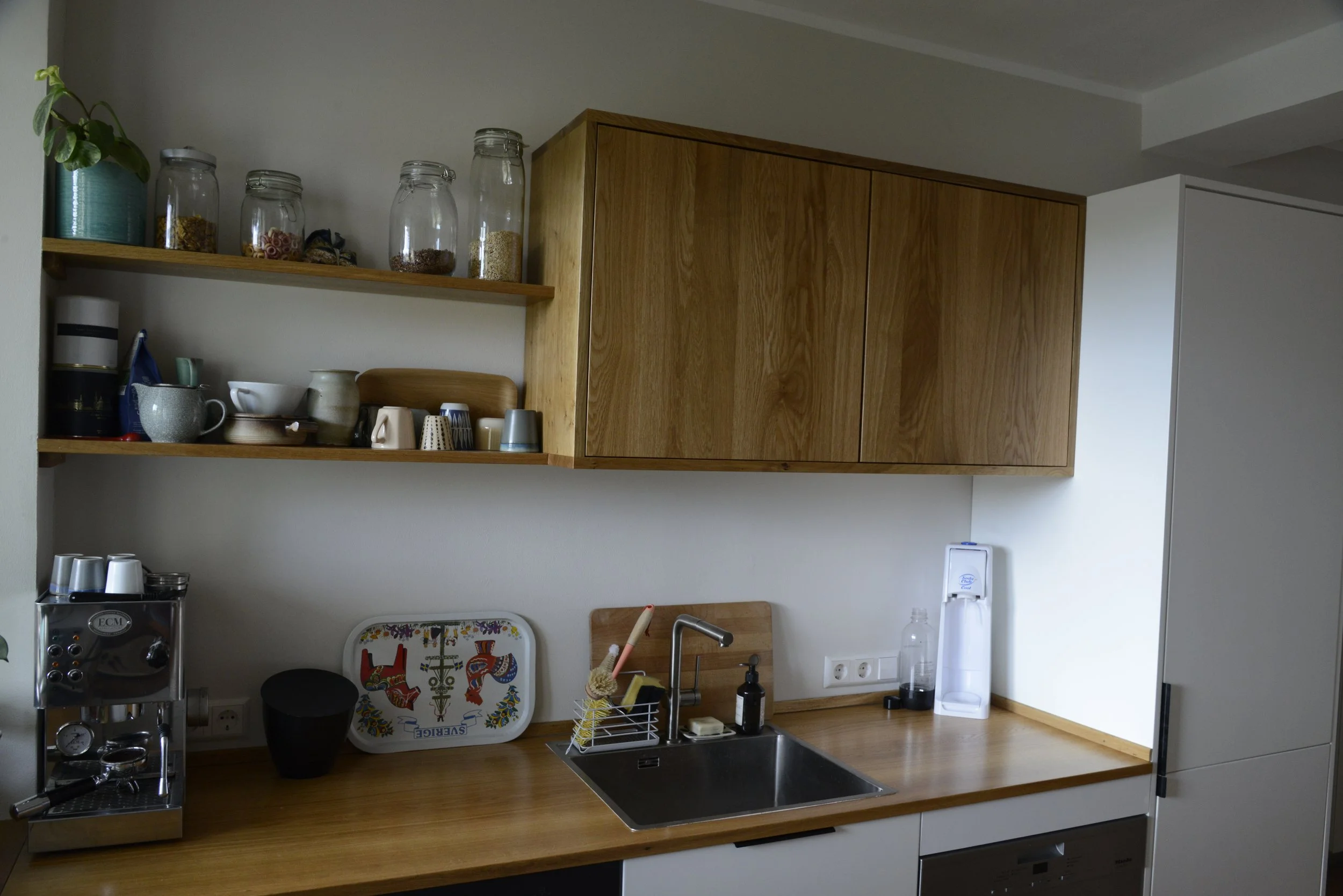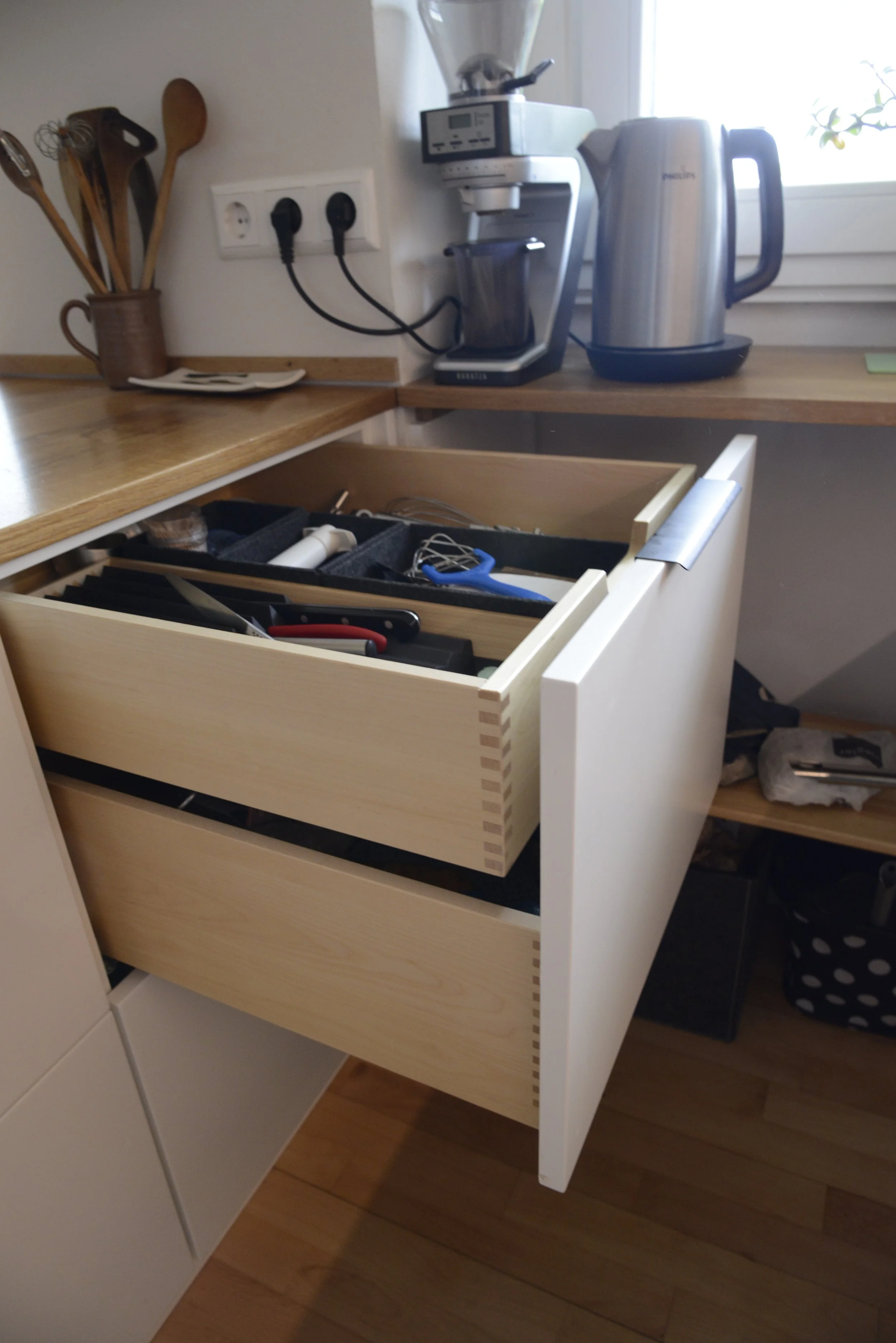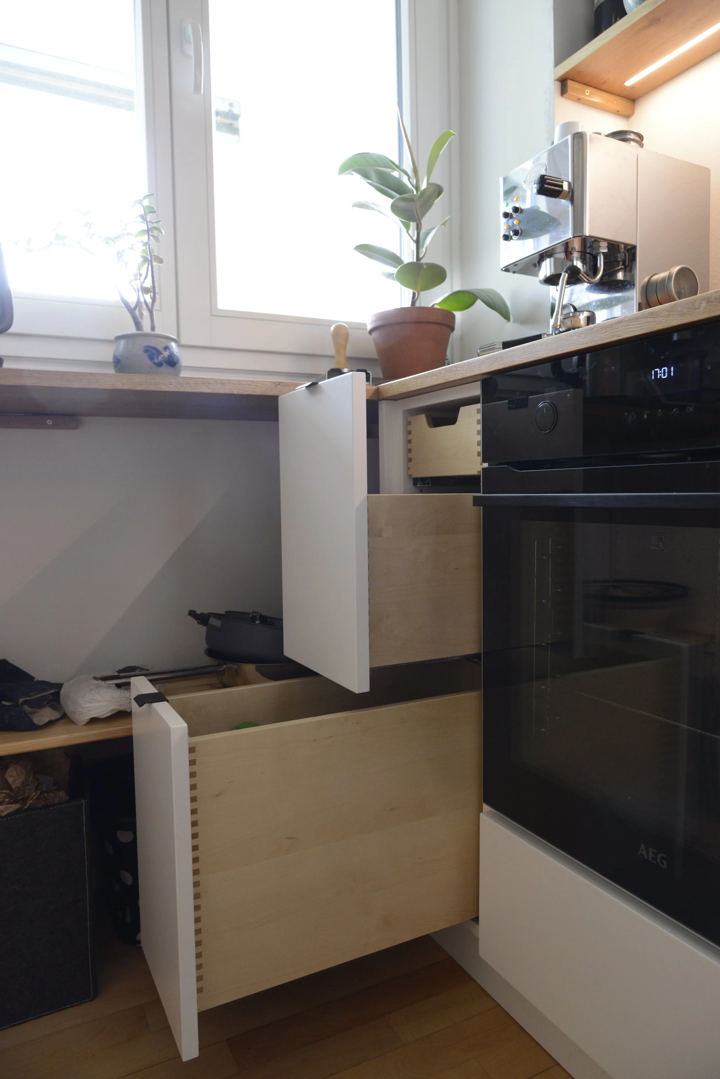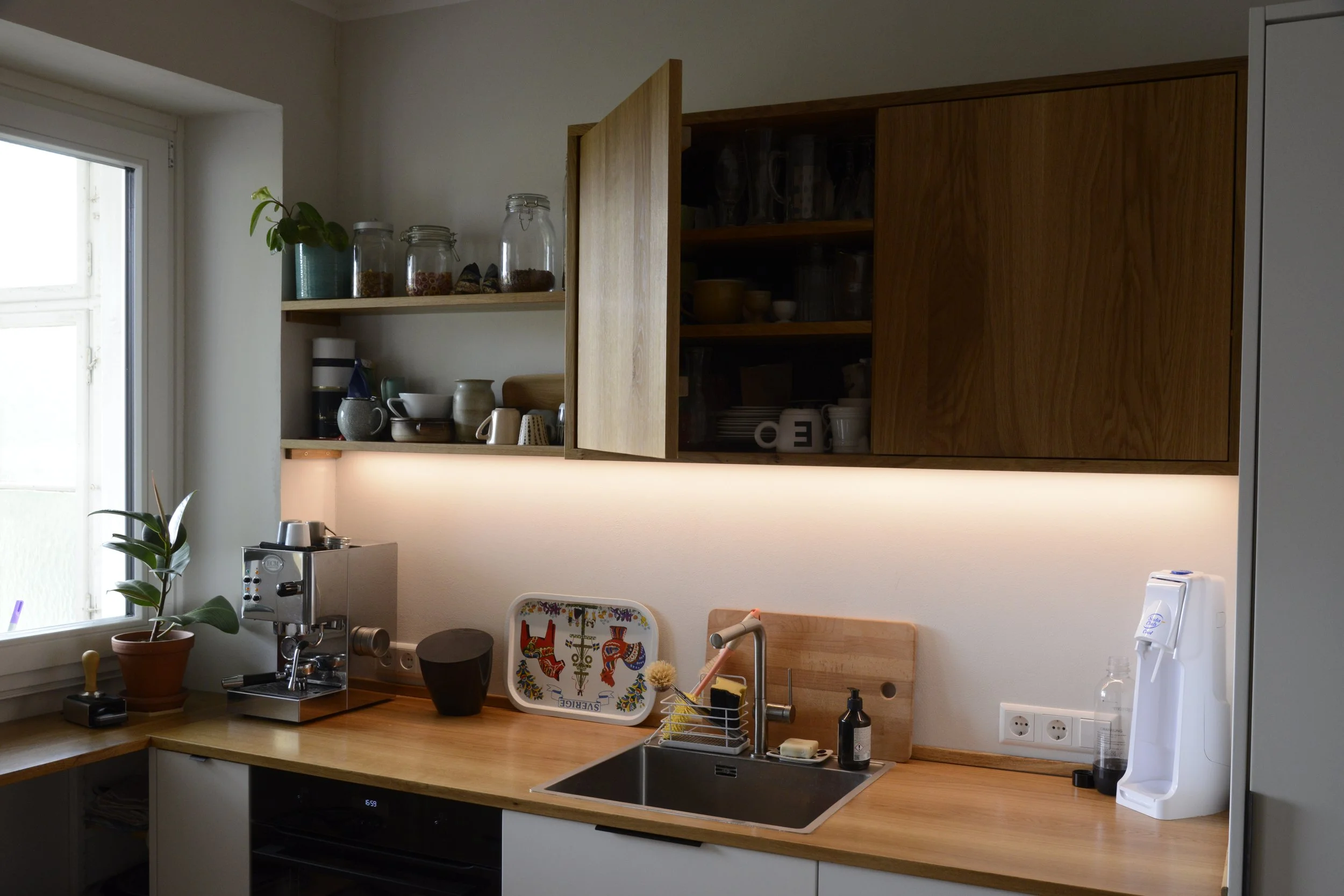 Küche aus MDF lackiert und Eiche. Vom Kunden abgeholt und in Heidelberg montiert.