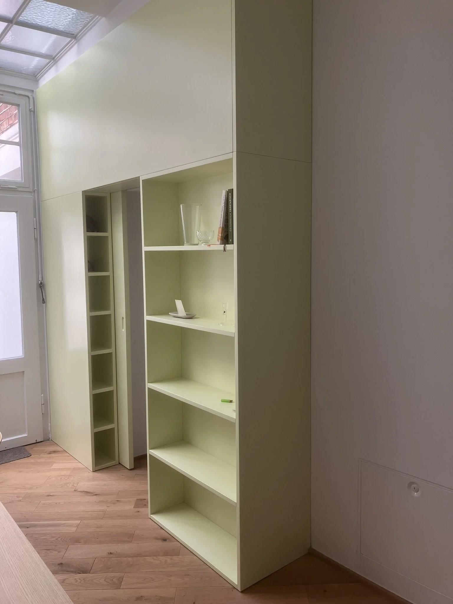 Regal Schiebetür Anlage aus MDF Grün lackiert, in Aachen montiert.